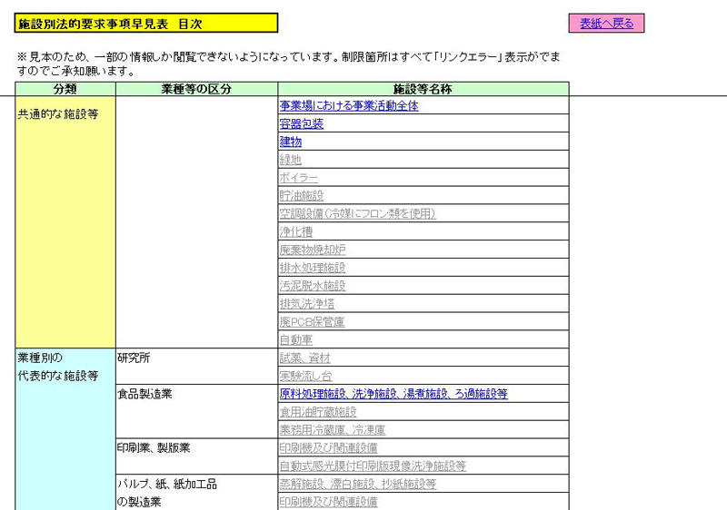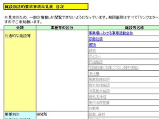 | ■要求事項早見表 | 法的要求事項が施設・管理事項別に見やすく整理されており、法規要約へ瞬時に移動できます。 |