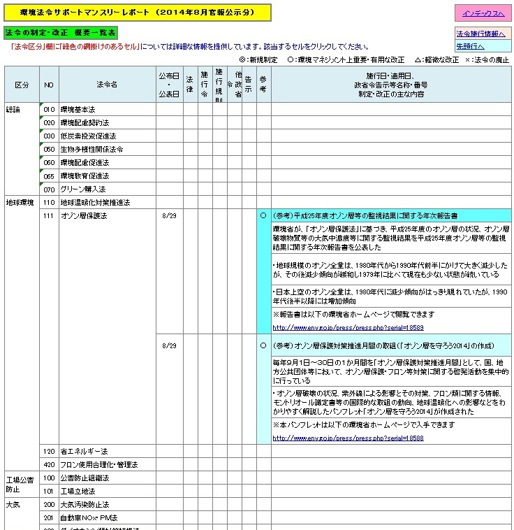 また、月次にて最新の環境法令改正情報および当月に起こった環境問題に関する行政、企業の取り組みをトピックスとしてとりまとめた情報も配信。環境法令や環境問題全般理解の情報源としてご活用いただけます。
