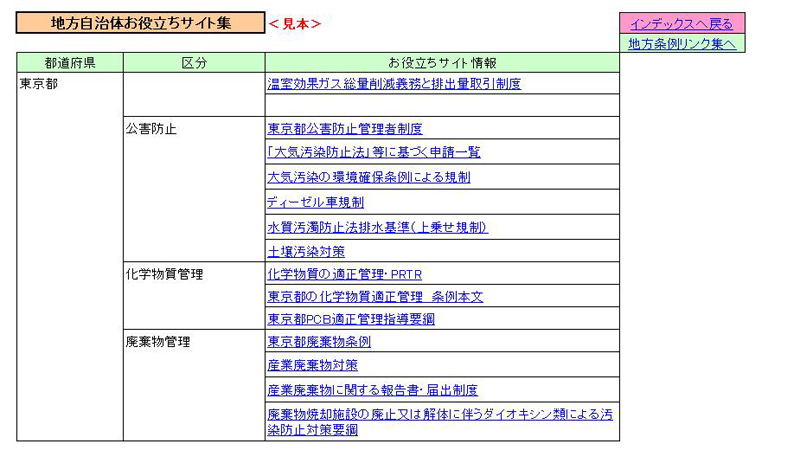 多くのユーザー様のニーズにお応えして、2012.04.01より環境法令サポートに「条例お役立ち情報」を追加しました! 各自治体の条例例規集へのリンクはもちろん、分かりやすい解説が付いた「お役立ちサイト」へのリンクも充実!